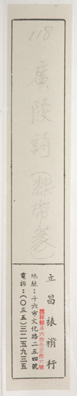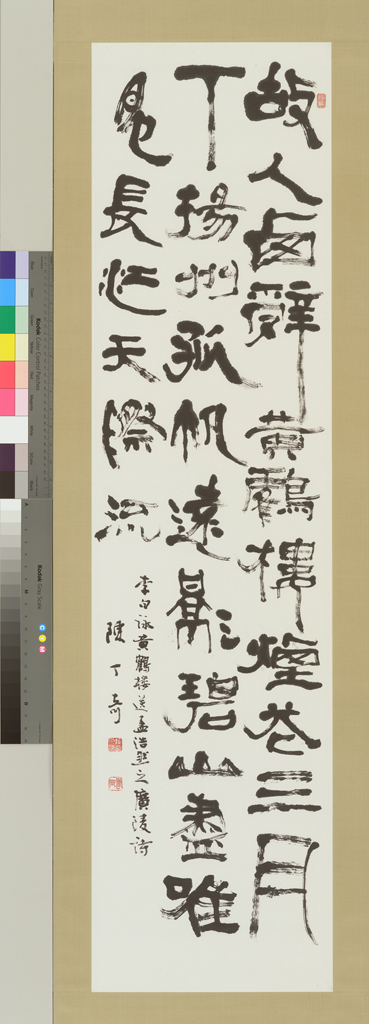 | 此幅主要是以隸書的筆意和字形來創作,但與一般隸書橫平豎直左右整齊排列的方式有別,所以出現了幾個特色:一、行間字距錯落,並將某些字的末筆拉長,造成顯著的空間,如辭、樓、月、下等;二、凸出墨色的濃淡、潤燥,並強調澀筆以彰顯下筆的力度;三、隸書體中間雜篆體、金文字形,如樓的右半、影的左半、畫、見、江等,使書寫表現的主體——文字,顯得豐富且饒趣味;至於在筆法的表現方面,則採取一種「率爾成章」的創作態度,讓毛筆的特性充分發揮,正因為不拘泥於中鋒、不規規於扁平格局,而一任筆隨手運地快意書寫,故能將書法藝術創作中的筆法、墨韻、造形、空間等的變化提升到了富含美學思維的境地。(蔡明讚賞析說明) |