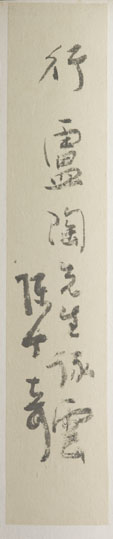 作品墨色稍淡,表現雲朵的高遠,全篇水氣飽滿,顯示雲中水蒸氣的特性。作品中前兩句,用筆技法表現雲在空中舒捲聚散,如「在」字特別的舒展,「聚散但隨風」特別的緊促,象徵在天地間遨遊的雲朵。第三句「化而歸江海」,表現遇冷氣的雲朵化為雨絲,落入江海,線條細小如雨,「化而歸」三字,字體拉長,律動有緻,猶如斜風細雨,綿綿不絕,「江海」二字在全篇中所佔重量最小,留白最多,景深最遠,似乎延伸到無際的天邊,江海ㄧ色。「輪迴」是全詩詩眼,以最顯眼的墨色線條,加重詩中語氣與意涵,「天地中」三字是厚實而渾重,體現朗朗乾坤的字畫。(邱進江賞析說明2009.11.27)