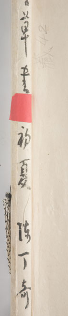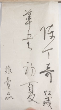 | 此詩原文是:廣武城邊逢暮春,汶陽恢客淚沾巾,落花寂寂啼山鳥,楊柳青青渡水人。陳老師擷取後兩句對句成一條幅,這種方式在日本的作品中,非常普遍,畫面中落、柳兩字為一塊;寂、渡、啼三字為一大塊;楊字為一塊,三塊突兀,其他則較凹,顯出整個畫面有凸有凹的立體感,好像從高空上看群峰一樣的視覺。至於字的走勢方面,第一行落花寂三字垂直往下走;啼山鳥三字往右緩緩做一弧形移動。另外第二行的柳字末筆即拉出向左,青青渡三字形成一向左的弧形;渡字結尾到水、人兩字又向右呈一弧形。總而言之,第二行從頭到尾就是一蛇形(S型),這種走勢在草書的動勢上非常重要。至於墨法方面,較大的字都墨色較濃,較小的字墨色較淡,這表示他醮一次墨就寫二、三個字,長的筆畫例如寂字的末筆用側鋒澀進;啼字末筆則用抖筆提出;人字末筆則用二段式行筆率意拔筆結束,感覺上墨色、筆勢、節奏都在字裡行間交互進行。至於留白方面,花字和青字間留一空白,結尾部份留一空白,一上一下,互相呼應也是非常對稱。我們沒有看陳老師寫,只憑畫面,推敲他當年的畫意,如果錄影傳真,一定是筆歌墨舞,精彩極了。(鄭聰明賞析說明) |