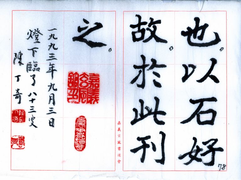 1.此臨書教材原稿本,前半(頁1-40))為75齡1985.4.10所臨書,後半(頁41-78)為83叟1993.9.3所續臨書。
