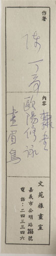 | 本件作品為天鶴先生晚年以隸書筆意夾雜篆書結構而書成的宋歐陽修《詠畫眉鳥》。此詩前二句描述畫眉鳥隨意飛翔、鳴聲於高低不同的花樹之中;借此表達詩人對無拘無束的生涯嚮往。後二句以畫眉鳥被鎖在「金籠」裡,雖有華麗的住居,總不如在林間的自由自在;詩人藉此表達精神得不到自由的痛苦。天鶴先生書寫此詩時依照詩意,以不同的筆意來進行創作,首句以厚重的筆調來書寫「百囀千聲」,「隨意移」則以輕鬆率意的筆法為之,漸入「山花紅紫」的原意之中,再以凝煉的筆調書寫「樹高低」三字而完成第一行的「重、輕、重」的節奏之美。第二行的「始知鎖尚(向)金籠聽」則配合第一行的首句七字進行輕重筆意的變化,最後一句「不及林間自在啼」又以較厚重的筆調來描寫失去自由得不到自在的沉悶痛苦之情。本作品第二行的「尚」字應為「向」字才合詩意,或因字形相近,恍惚而誤植。(蘇友泉賞析說明) |