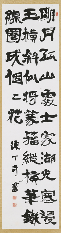 | 此幅作於五十六歲,除了漢簡欹斜、稚拙的結體,也令人聯想〈夏承碑〉一類結字奇特,隸、篆雜揉的形式。全幅以行草運筆作隸,看似方筆卻充滿圓腴的筆畫。早期豐潤的隸書筆致,和他寫顏或〈鄭文公碑〉等圓渾豐實的筆觸有些關連性;觀賞他的各體書,其線質極具統一感、辨識度。此幅間又夾雜些犀利細勁如曲鐵的游絲線質,在書壇偏多整飭,或橫平豎直的臺灣隸法傳統中,顯得獨樹一格。